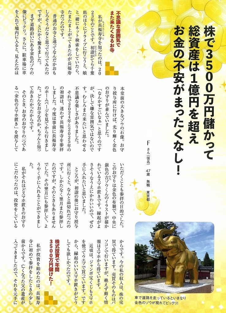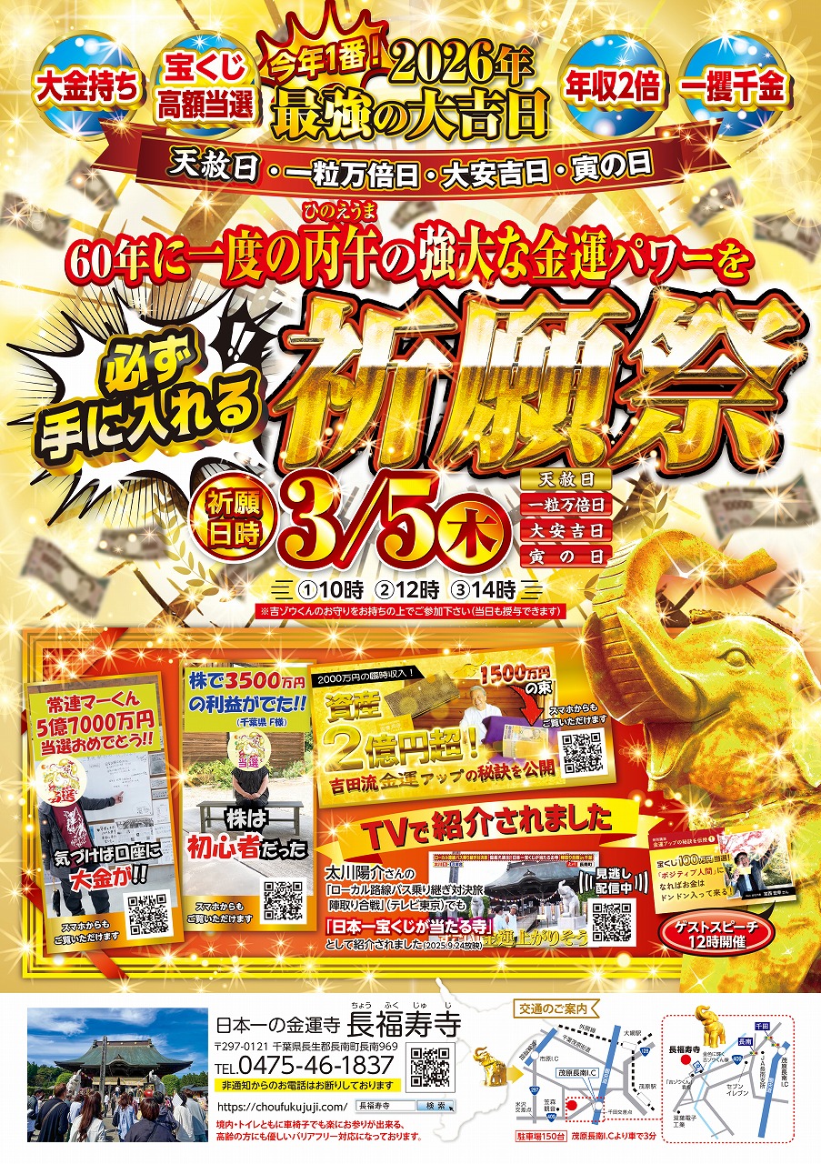 さあ、あなたも関東NO.1の「金運増大」パワースポット・長福寿寺の吉ゾウくんに、金運増大・宝くじの高額当選を実現してもらいましょう!