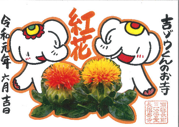 ①長福寿寺の紅花(吉ゾウくんのスタンプ)