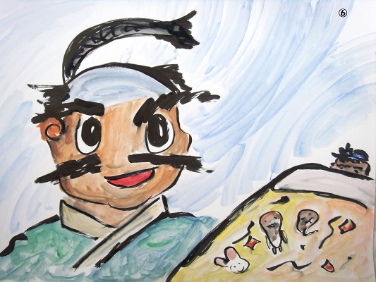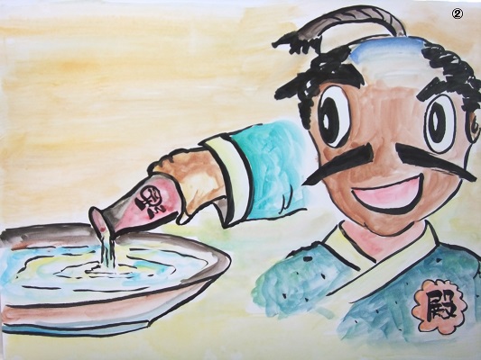 権兵衛さんはお殿様が注いでくれたお酒を飲もうと、ひょいっと顔をあげ、盃を見ると…