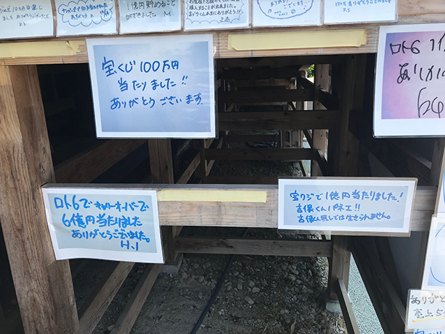 縁の下に限らず、お寺の横の壁面や階段にもいろいろ貼ってあります。