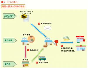 ヤマトクレジットファイナンス株式会社が商品代金を購入店に対し立替払いを行った上、購入者様にご請求させていただき、購入者様はコンビニ支払・郵便振替の方法により、商品代金をお支払いいただきます。