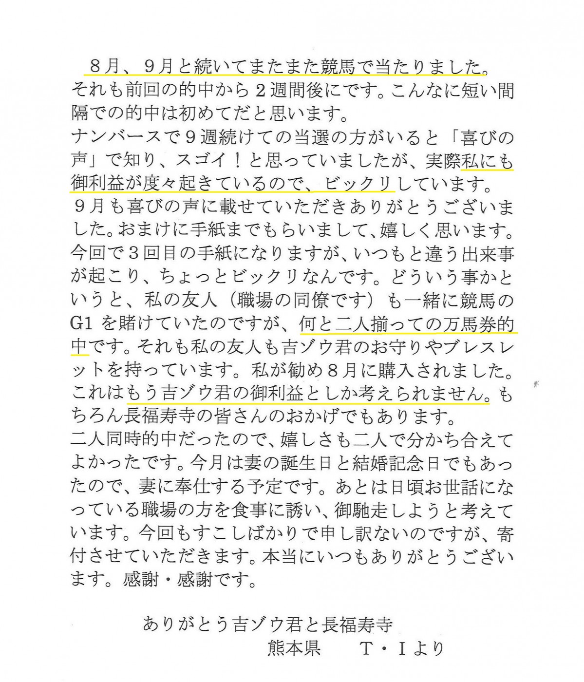 今後も、感謝を忘れず、当たった時には、お世話になった人たちに少しでも恩返しをしていこうと思います。 (熊本県 T・I)
