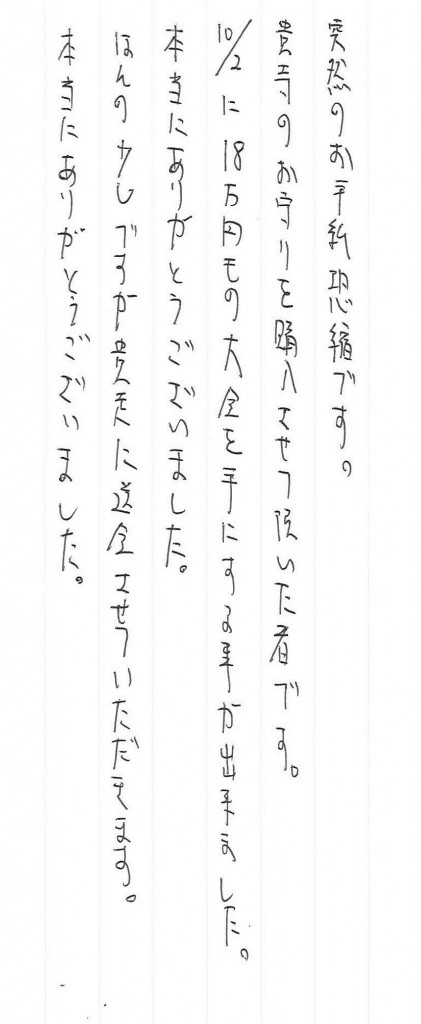 貴寺のお守りを購入させて頂いた者です。