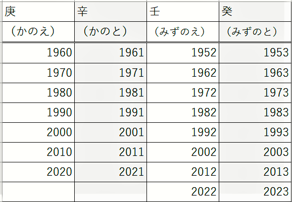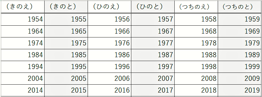 あなたの生まれた年(西暦)から「十干(じっかん)」を見つけて下さい。