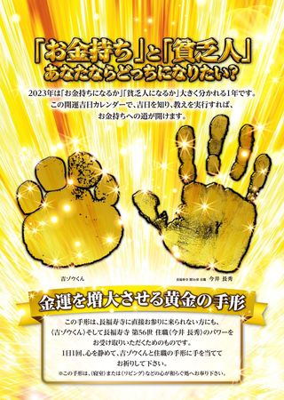 この【開運吉日】カレンダーには、吉ゾウくんと住職の【金運を増大させる黄金の手形】が付いています。