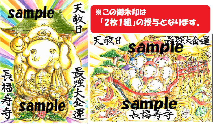 ①の【七福神&宝船】の御朱印は、七福神が乗った宝船からお宝が溢れ出ています。《大金持ち》の証です。