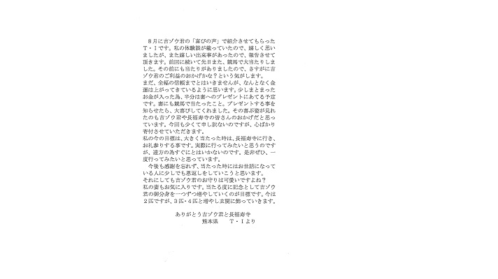 長福寿寺のサイトで、当たったお金は自分のためだけに使うのではなく、他人のためにも使うようにと書かれていましたので、少しですが寄付させていただきました。