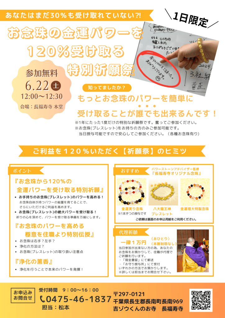 本来のパワーを最大限に受け取っていただくお手伝いとして、当山では6/22(土)に【念珠祈願祭】開催。