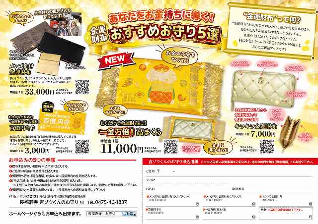 長福寿寺の「金運財布」「百億円守り」、もしくは新登場の「一金万倍の高枕」をお持ちの方のみご参加いただけます。もちろん、当日にも授与できます。