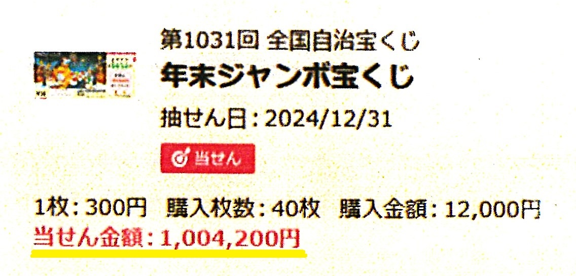 年末ジャンボ宝くじ100万円当選!