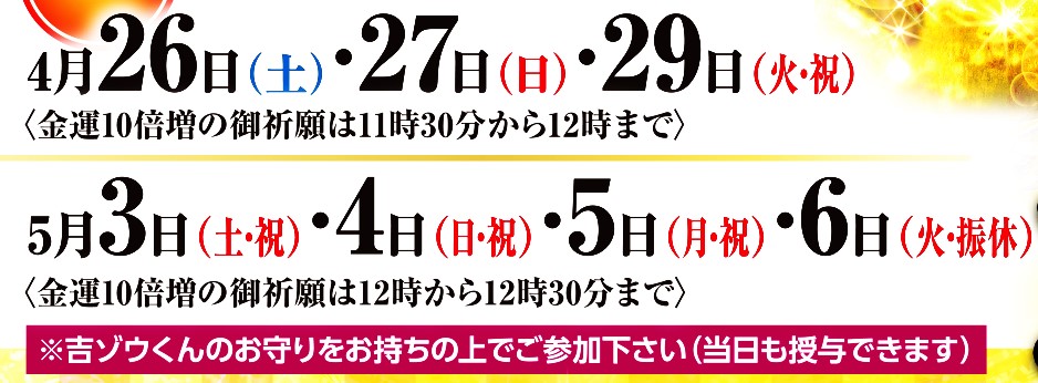 全日とも「金運10倍増の御祈願」の後にお話しします。(20分程度)