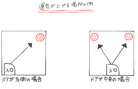 運気というのは、玄関から入り部屋の隅に集まるといわれ、どの部屋でも入口から見て対角線上ある角が運気の上がる場所となります。