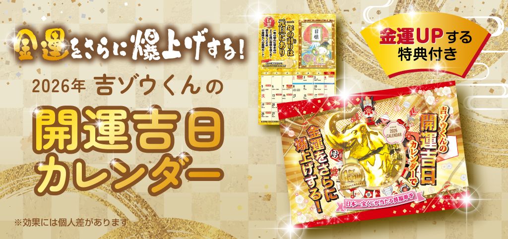 「なんとしても来年2026年は金運を上げてお金持ちになりたい!」という方は、是非【2026年版 吉ゾウくんの開運吉日カレンダー】を授与してください!