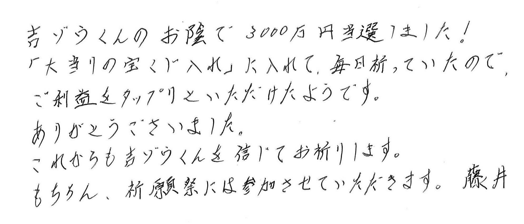 ハロウィンジャンボ宝くじで【3000万円当選】した藤井さんの宝くじ当選パワーを込めた「サイン(コピー)」付きです。