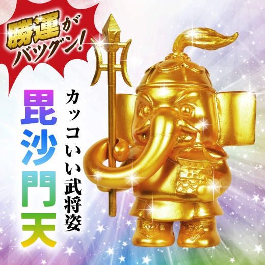 勝利をもたらす神として有名で、鎧を身につけたカッコいい武将姿で、右手に宝棒、左手に宝塔を持っています。