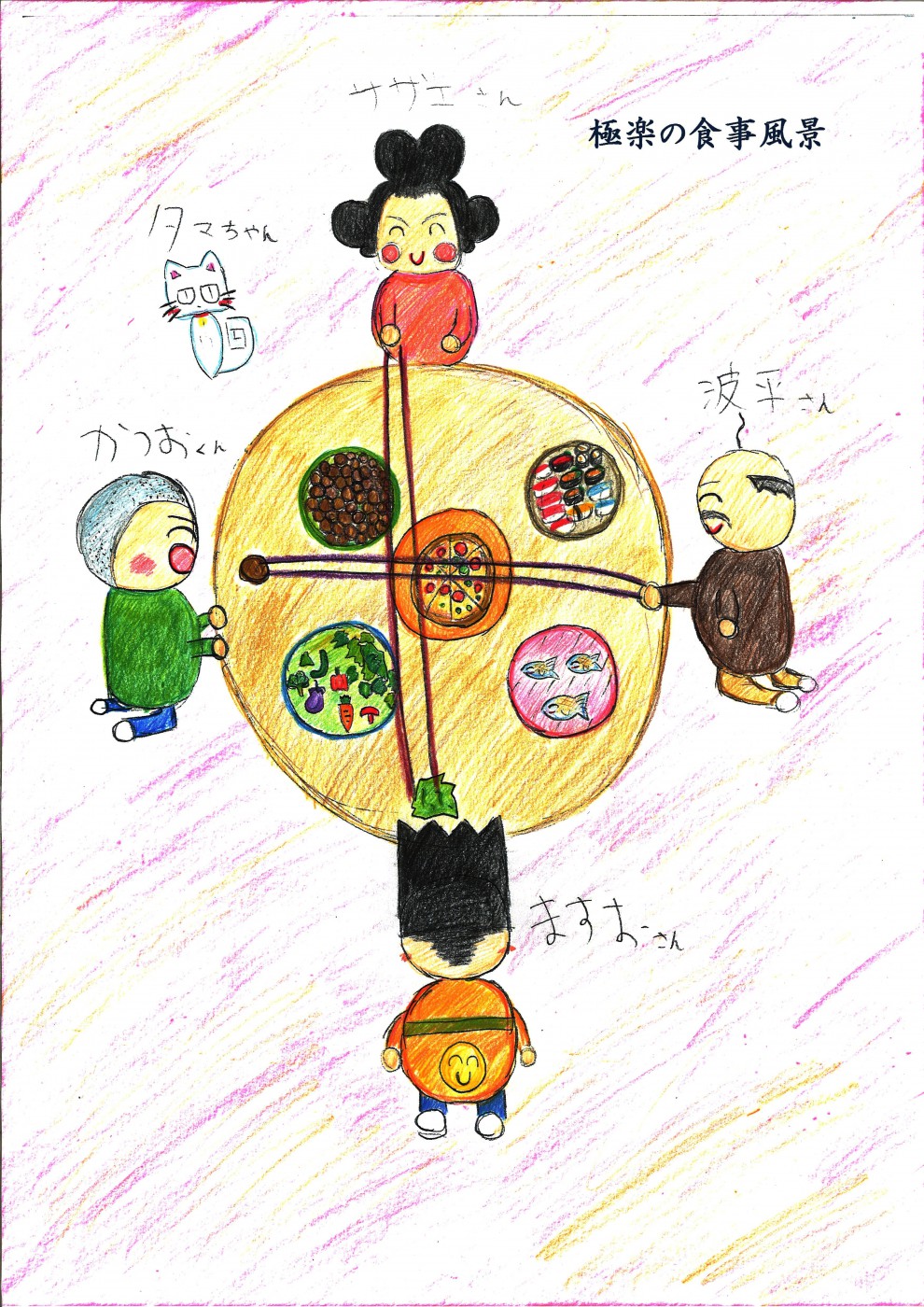 一方、極楽の方は長い箸を使って向かい側の方に「お先にどうぞ」と食べさせてあげます。