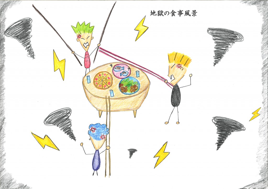 でも、地獄では、その長い箸で我先にと自分が食べようとするため、どうしても自分の口に入らず、食べ物は落ちてしまいます。