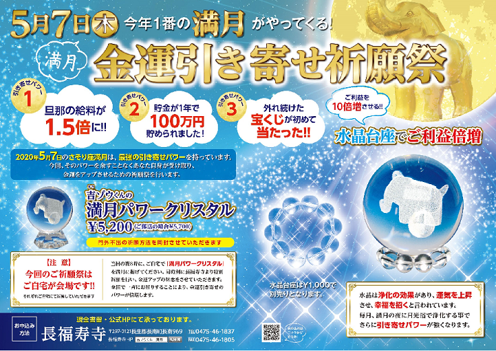 「金運引き寄せ祈願祭」では「吉ゾウくんの満月パワークリスタル」を満月に掲げて「お願い事」+「おまじない」+「ありがとうございます」を3回お唱えし、ご祈願を行って頂きます。