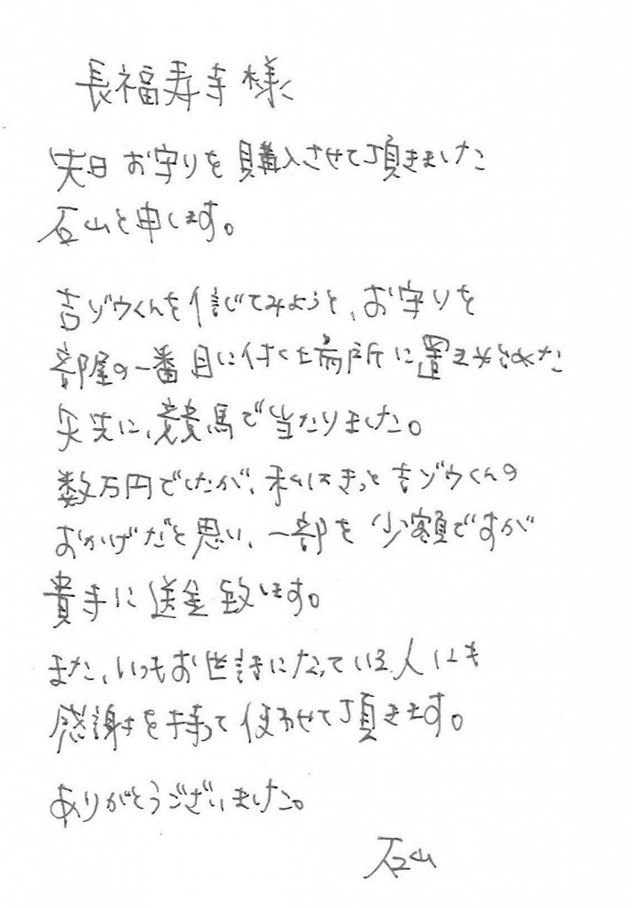 本来なら長福寿寺の方へ行き、お礼をしたいのですが、愛知県からだと、すぐには行かれないので、お手紙にしました。