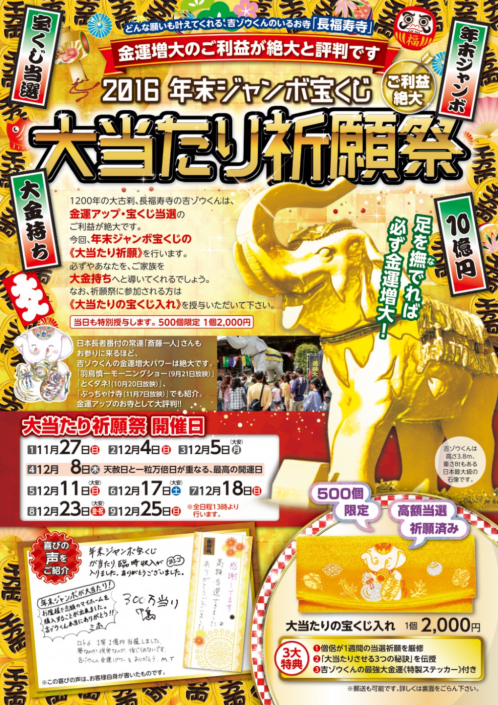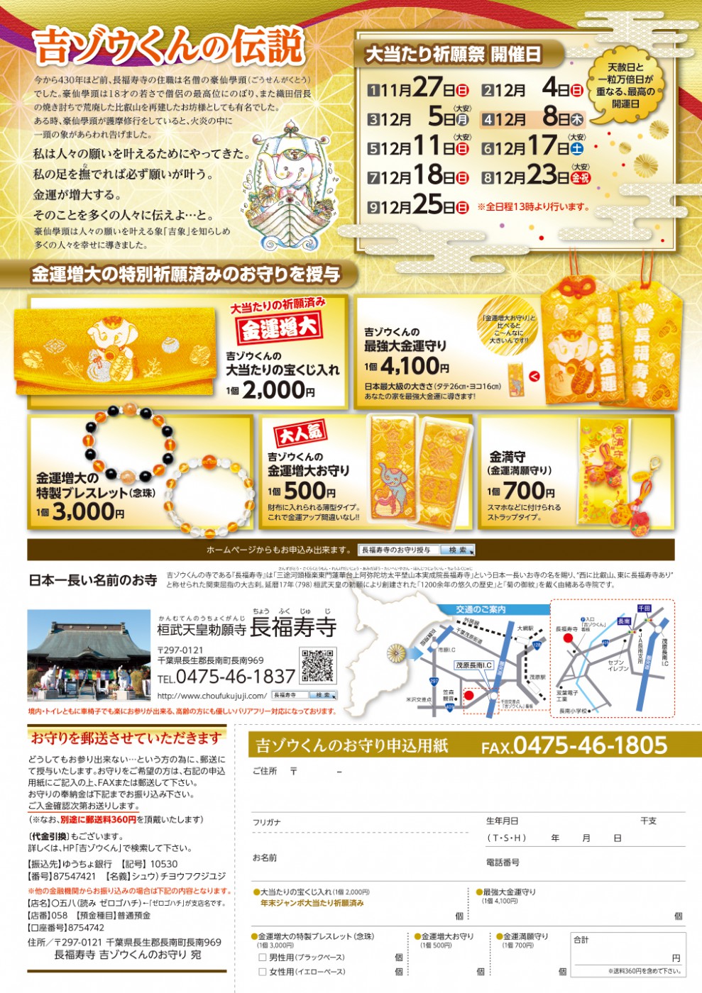 1200年の大古刹・長福寿寺に奉られる吉ゾウくんは、金運アップ・宝くじ当選のご利益が絶大です。