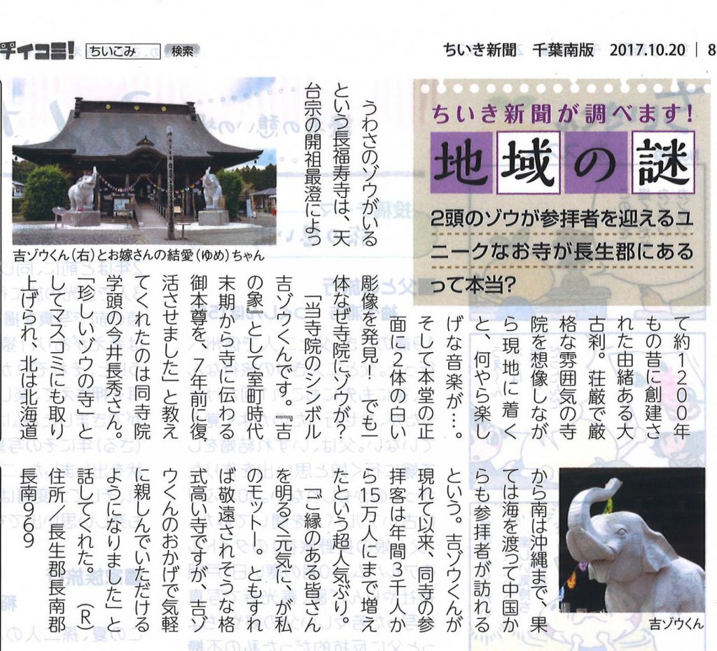 『地域新聞』千葉南版(2017年10月20日号)に「吉ゾウくん」が紹介されているゾウ♫