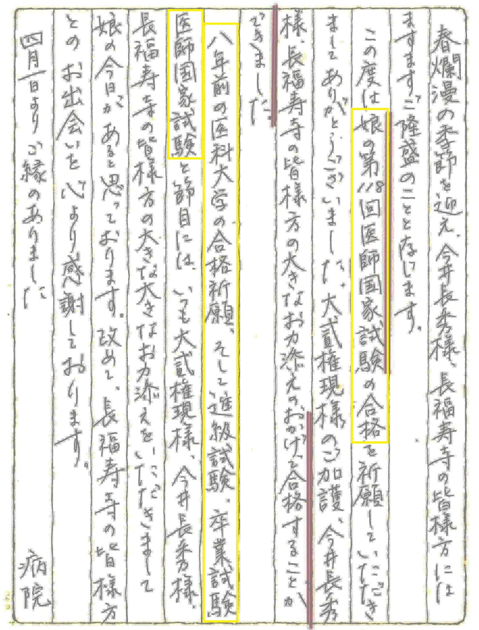 娘の医師国家試験合格を祈願していただきましてありがとうございました。